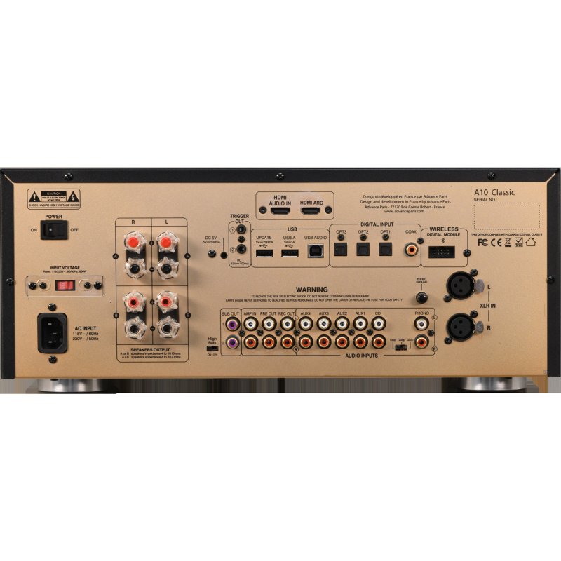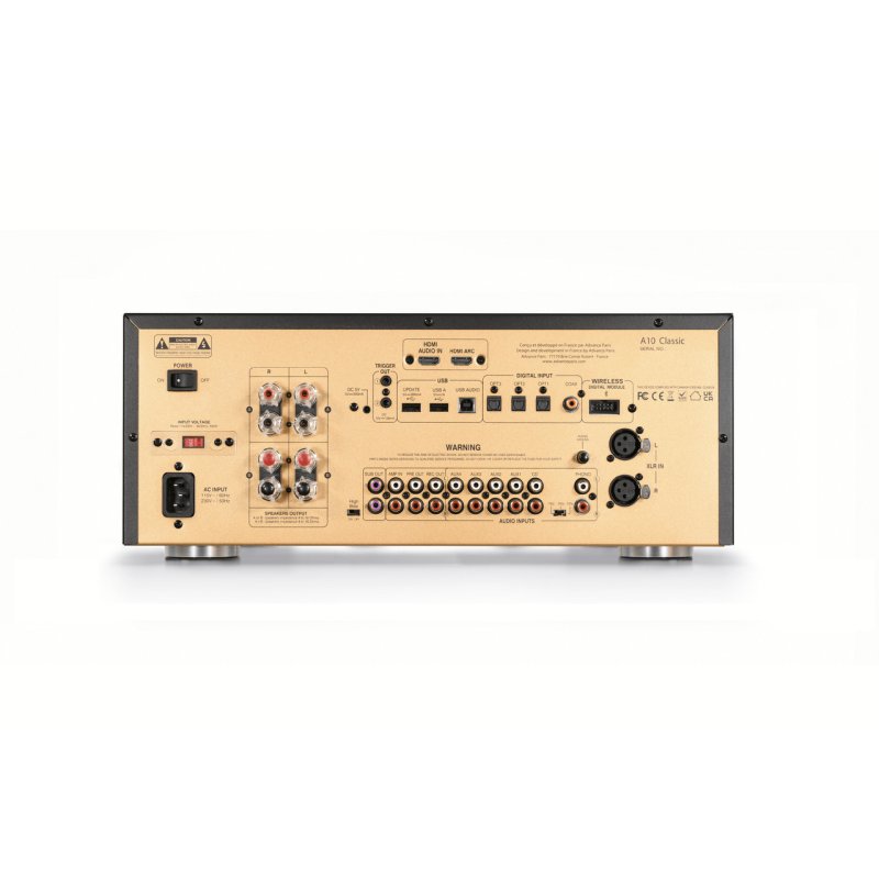 The A10 Classic offers six analogue inputs: four auxiliary RCA, one dedicated CD, one tuner, and a balanced XLR input for source components with balanced outputs. A moving-magnet phono stage with three selectable capacitance settings (100, 200, and 320 pF) accommodates a range of MM cartridges directly, eliminating the need for an external phono preamplifier.
